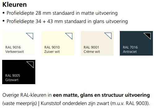 kunststof onderdelen zijn zwart (m.u.v. RAL 9016 & RAL 9003).